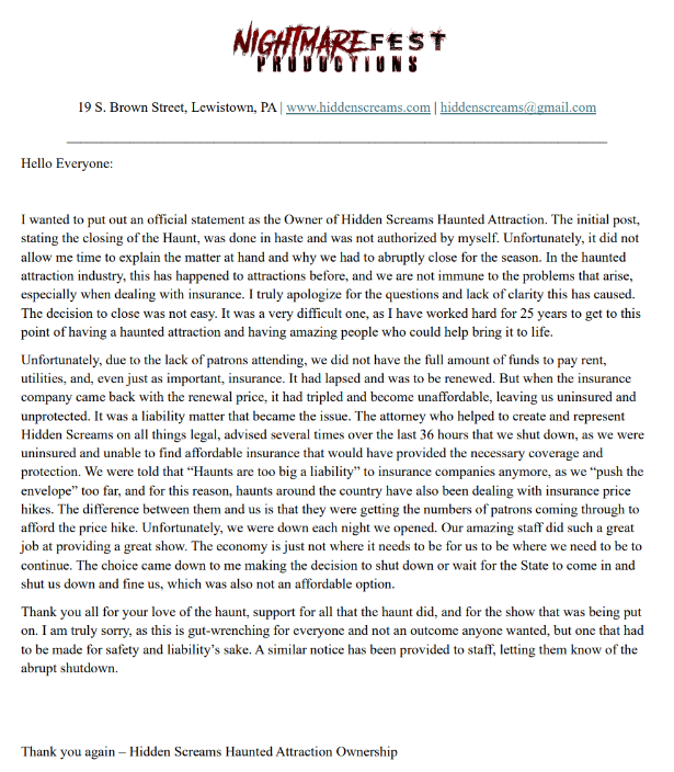 Experience terror like never before when you enter Hiddens Screams Haunted Attraction this October. You will face all-new characters, all-new twists and turns, and a new kind of fear! Are you ready for the "In Your Face Fears" that are being prepared for you this October? Only time will tell.